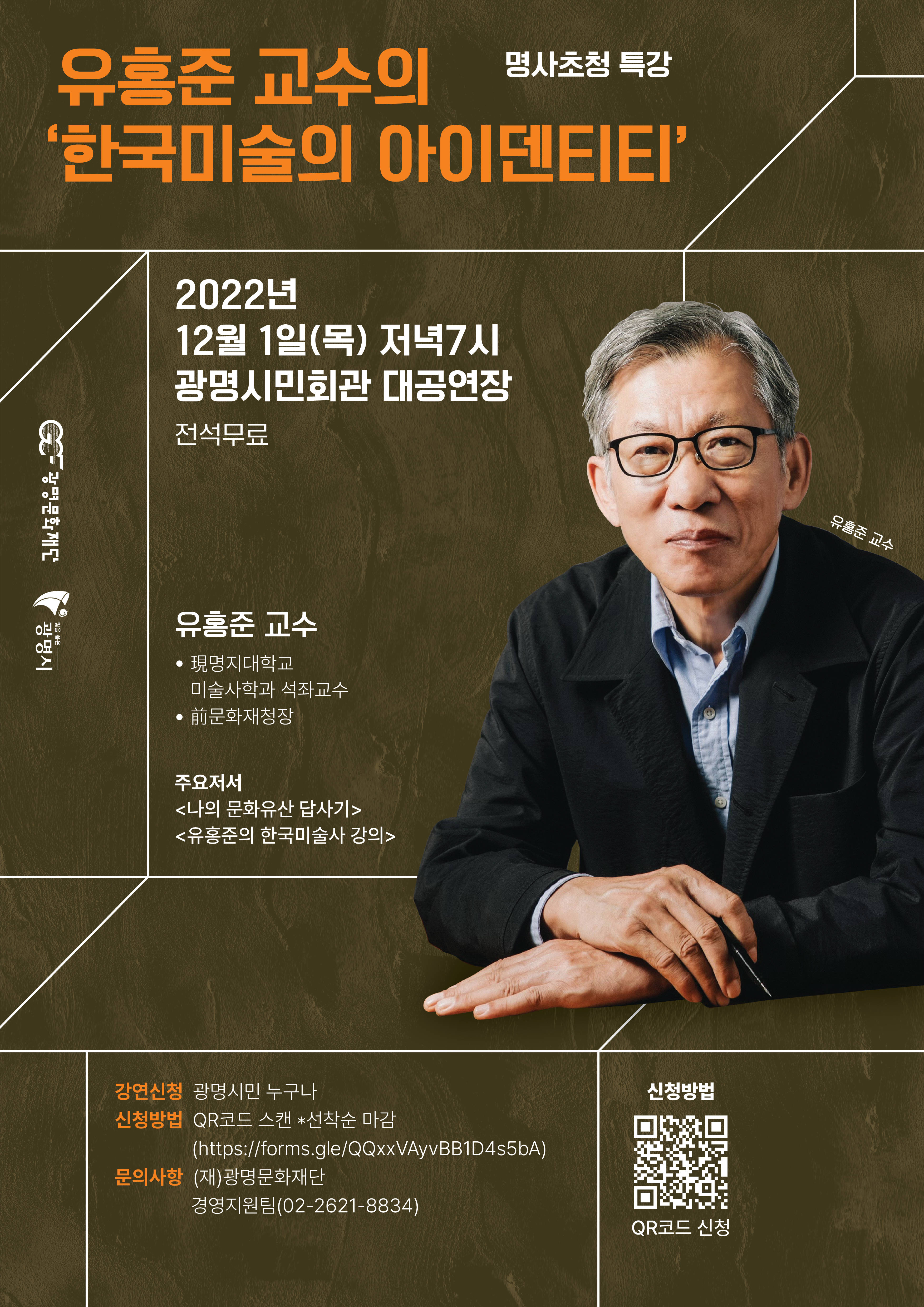 유홍준 교수 초청 특강은 모바일 링크(QR코드)를 통해 참가 신청이 가능하며, 광명시민 누구나 무료로 참여할 수 있다. 자세한 사항은 광명문화재단 경영지원팀(☎02-2621-8834)으로 문의하면 된다.