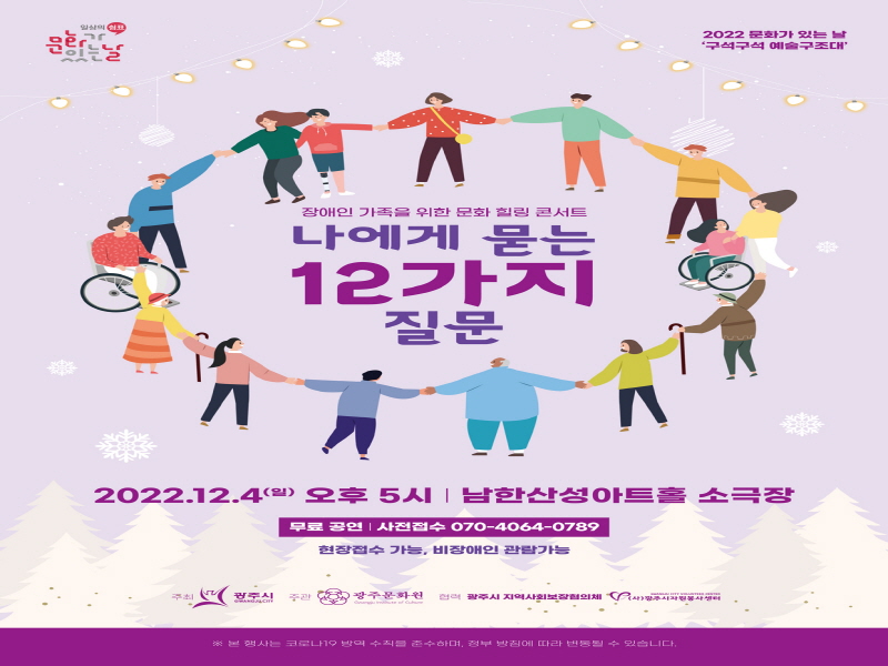 광주시는 2022년 문화가 있는 날 지역특화프로그램 ‘구석구석 예술구조대’ 사업으로 오는 12월 4일 장애인 가족들을 위한 문화예술 힐링 프로그램 공연을 개최한다고 29일 밝혔다.