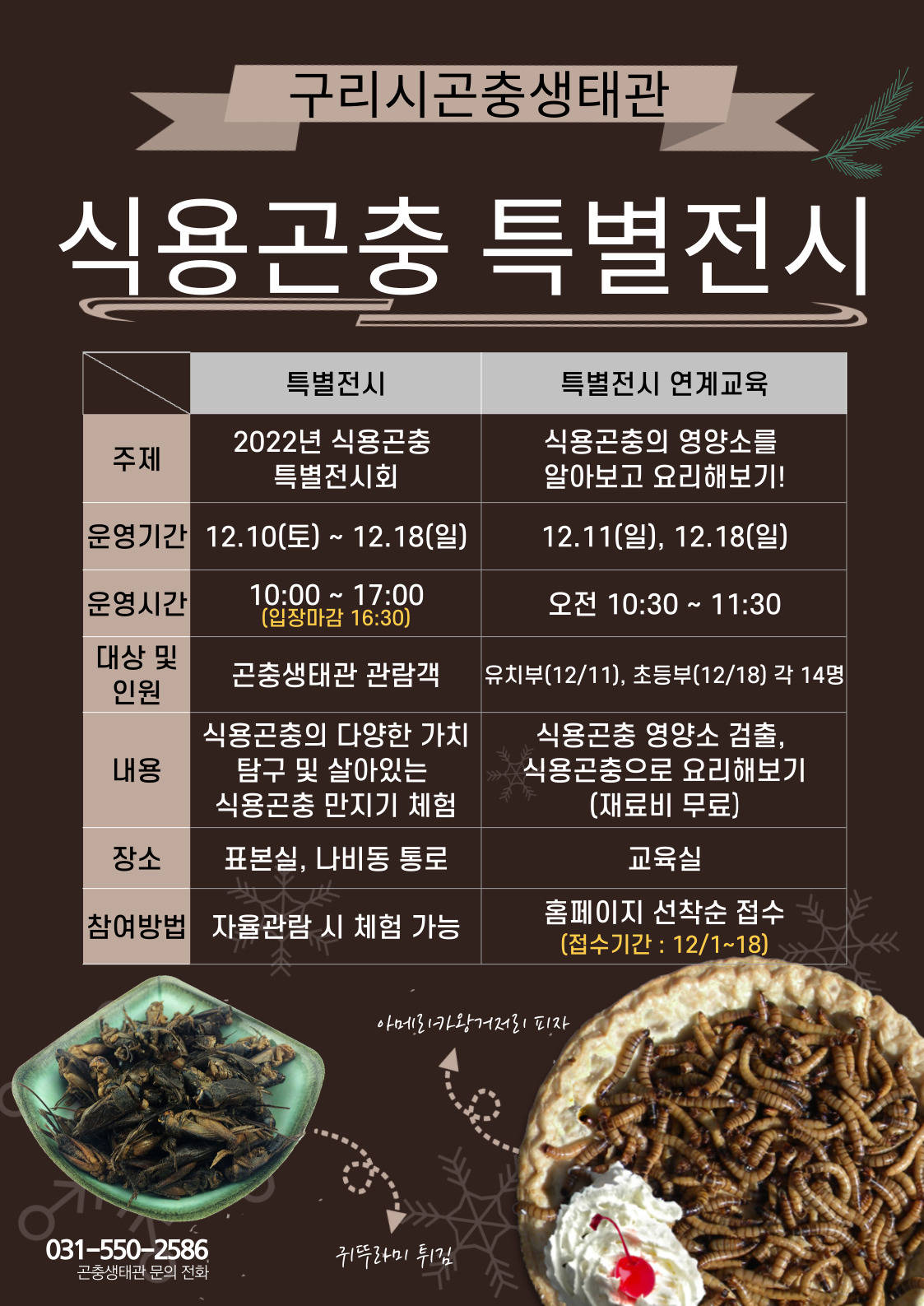 구리시(시장 백경현)는 오는 12월 10일부터 18일까지 곤충생태관 표본실에서 ‘2022년 구리시 곤충생태관 식용곤충 특별전시’를 개최한다.