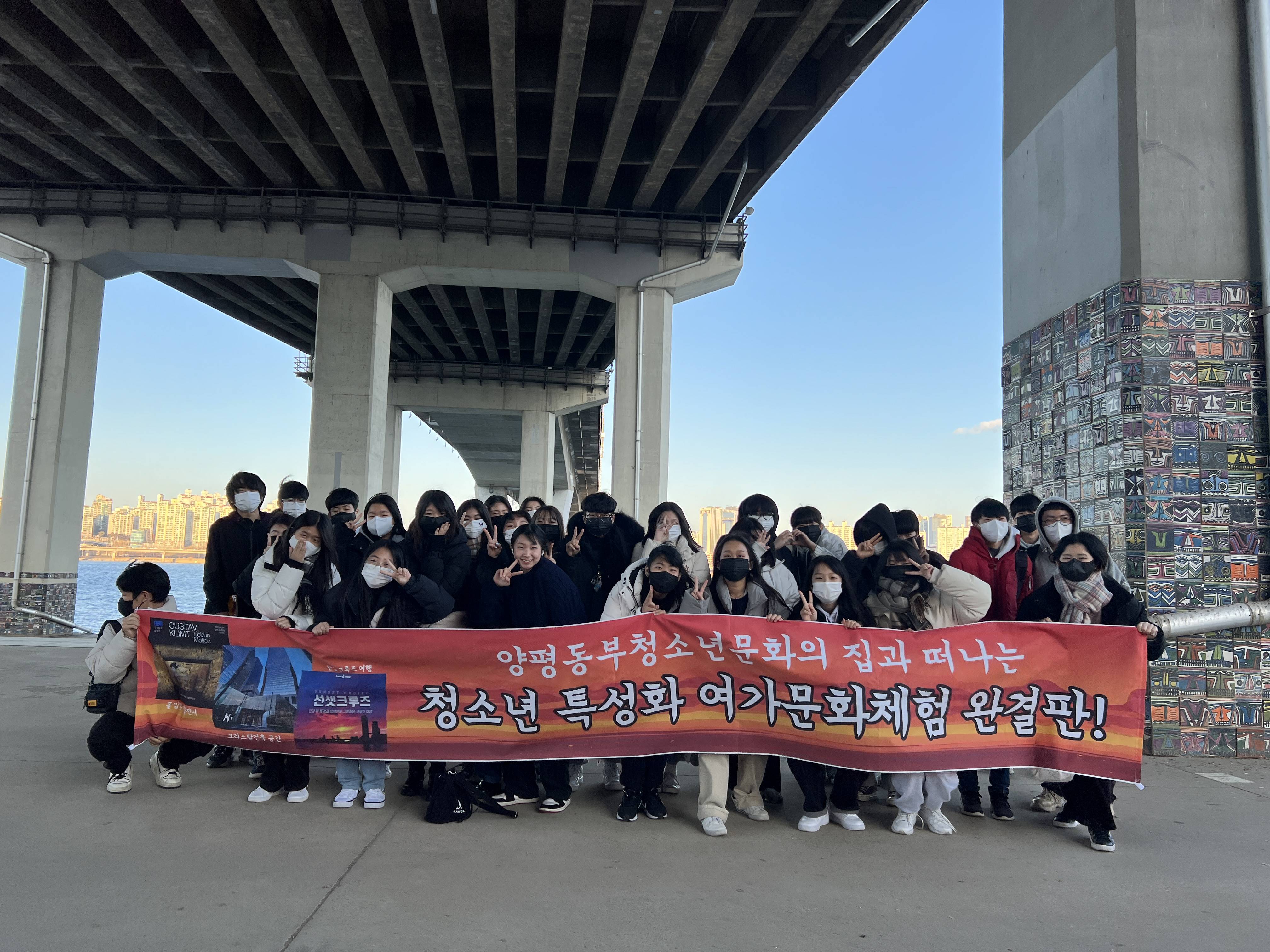 이번 문화캠프는 청소년문화의집을 이용하는 청소년 30명과 함께 청소년의 오감을 자극하는 몰입형 전시 아트 빛의 시어터 관람과 한강 위에서 일몰과 자연 풍광을 즐기며 스트레스를 해소할 수 있는 선셋 크루즈 체험이 진행됐다.