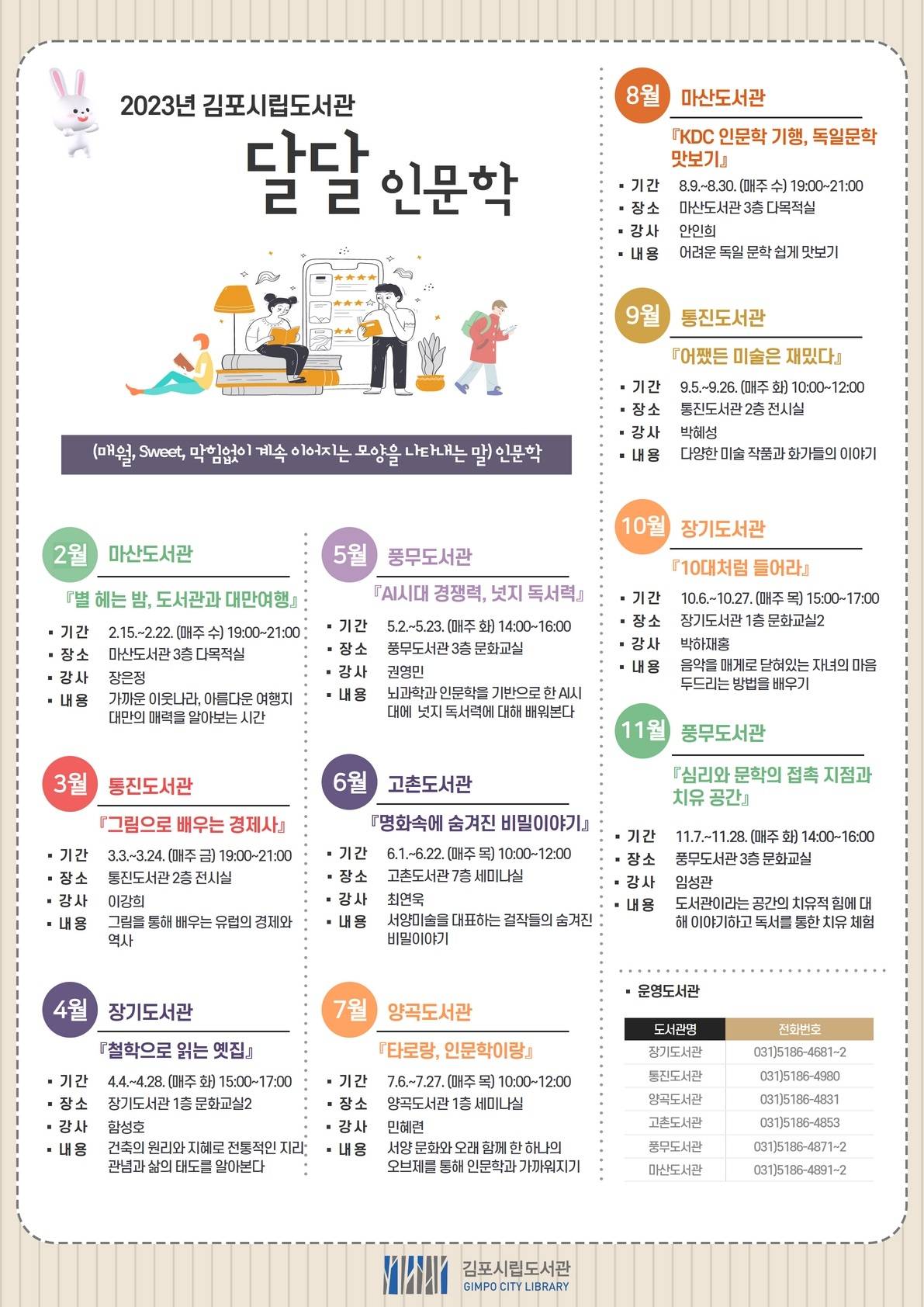 이어 3월에는 통진도서관 「그림으로 배우는 경제사」, 4월 장기도서관 「철학으로 읽는 옛집」, 5월 풍무도서관 「AI시대 경쟁력, 넛지 독서력」, 6월 고촌도서관 「명화 속에 숨겨진 비밀이야기」, 7월 양곡도서관 「타로랑, 인문학이랑」, 8월 마산도서관 「KDC 인문학 기행, 독일문학 맛보기」, 9월 통진도서관 「어쨌든 미술은 재밌다」, 10월 장기도서관 「10대처럼 들어라」, 11월 풍무도서관 「심리와 문학의 접촉 지점과 치유 공간」으로 진행된다.