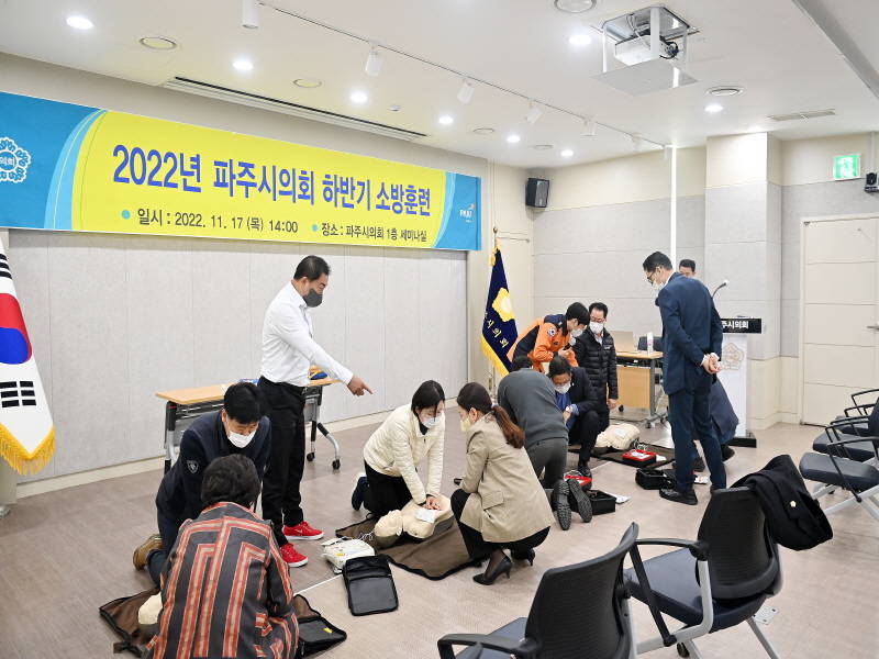 파주시의회(의장 이성철)는 지난 17일 파주시의회 1층 세미나실에서 시의원들과 전 직원을 대상으로 소방 합동훈련을 실시했다.