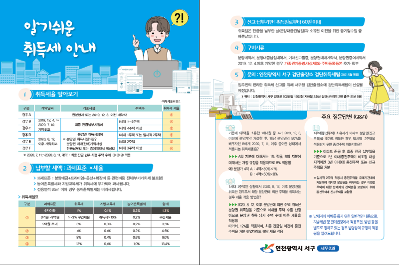 특히 서구는 취득세 담당으로 이루어진 TF(태스크포스)를 구성하고 검단신도시 입주 시기 도래 전 취득세 리플릿 배부를 통해 입주민의 불편사항이 발생하지 않도록 선제적으로 대응하며 입주민 중심의 행정에 초점을 맞추고 있다.