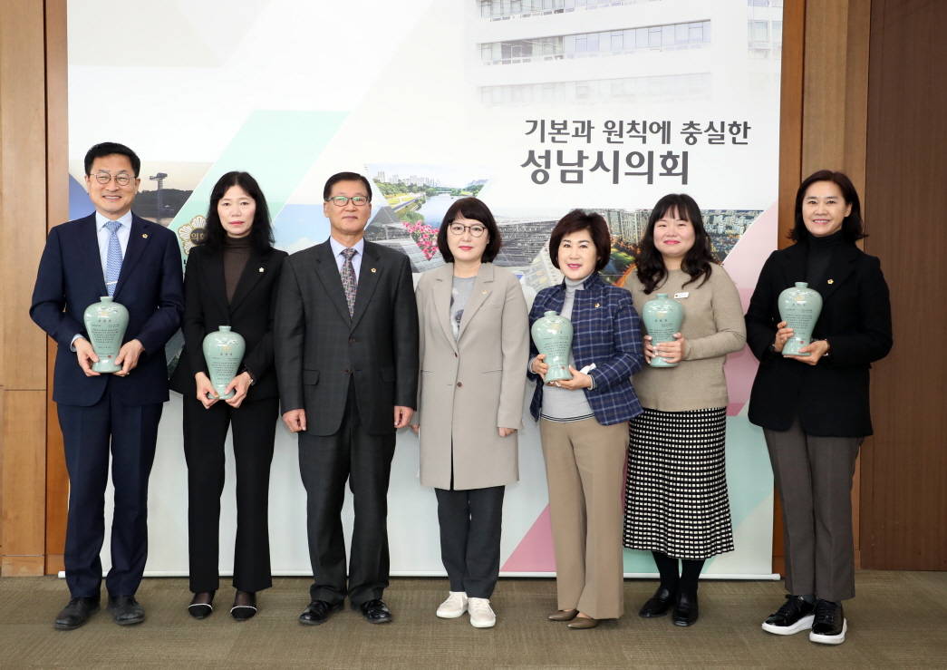 성남시의회에서는 의정연구발전 분야에 서은경 의원, 지역경제활성화 분야에 정연화 의원, 의정활동개선 분야에 박종각 의원, 의정활동 분야에 박명순 의원이 주민을 위한 의정활동 공로를 인정받아 수상의 영예를 안았다.