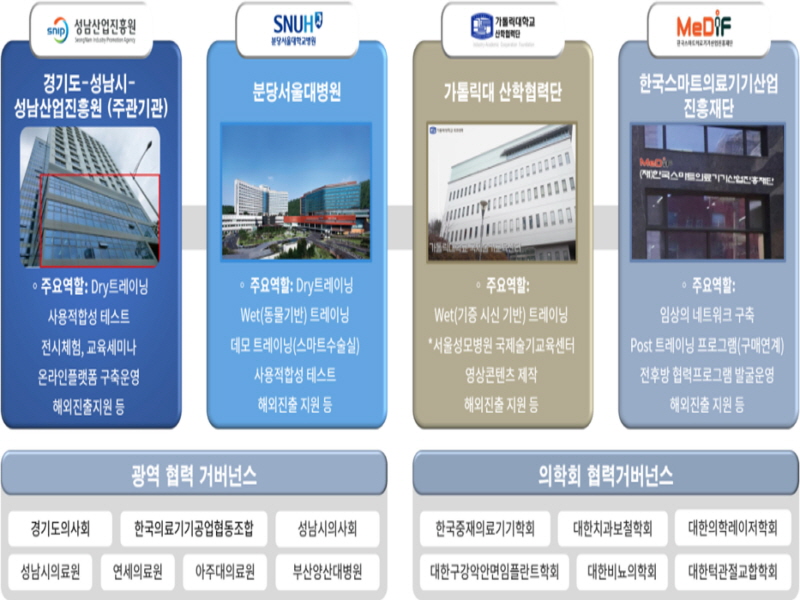 특히 경기 성남시 컨소시엄은 국내 최고수준의 시설인프라와 의료 인적자원, 산업육성 노하우를 바탕으로 이론교육-인체모형-동물-해부용시신-환자 기반의 5단계 의료기기 교육훈련 프로그램을 구축하였으며, 경기도의사회, 성남시의사회, 성남시의료원, 한국의료기기공업협동조합, 주요 의학회 등 20여개 핵심기관과 협력체계를 구축해 K의료기기 테스트베드 혁신을 주도할 예정이다.