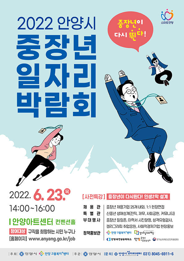 일자리를 희망하는 중장년층이라면 돌아오는 23일 오후 2시 안양아트센터를 잘 기억해둬야 할 것이다. 그들에 맞춘 일자리 행사가 열리기 때문이다.안양시가 고용 촉진을 위한 2022 중장년 일자리 박람회‘중장년이 다시 뛴다!’를 목요일인 오는 23일 오후 2시부터 4시까지 안양아트센터 컨벤션홀에서 개최한다고 20일 밝혔다. 구직을 원하는 시민이면 누구나가 대상이다.