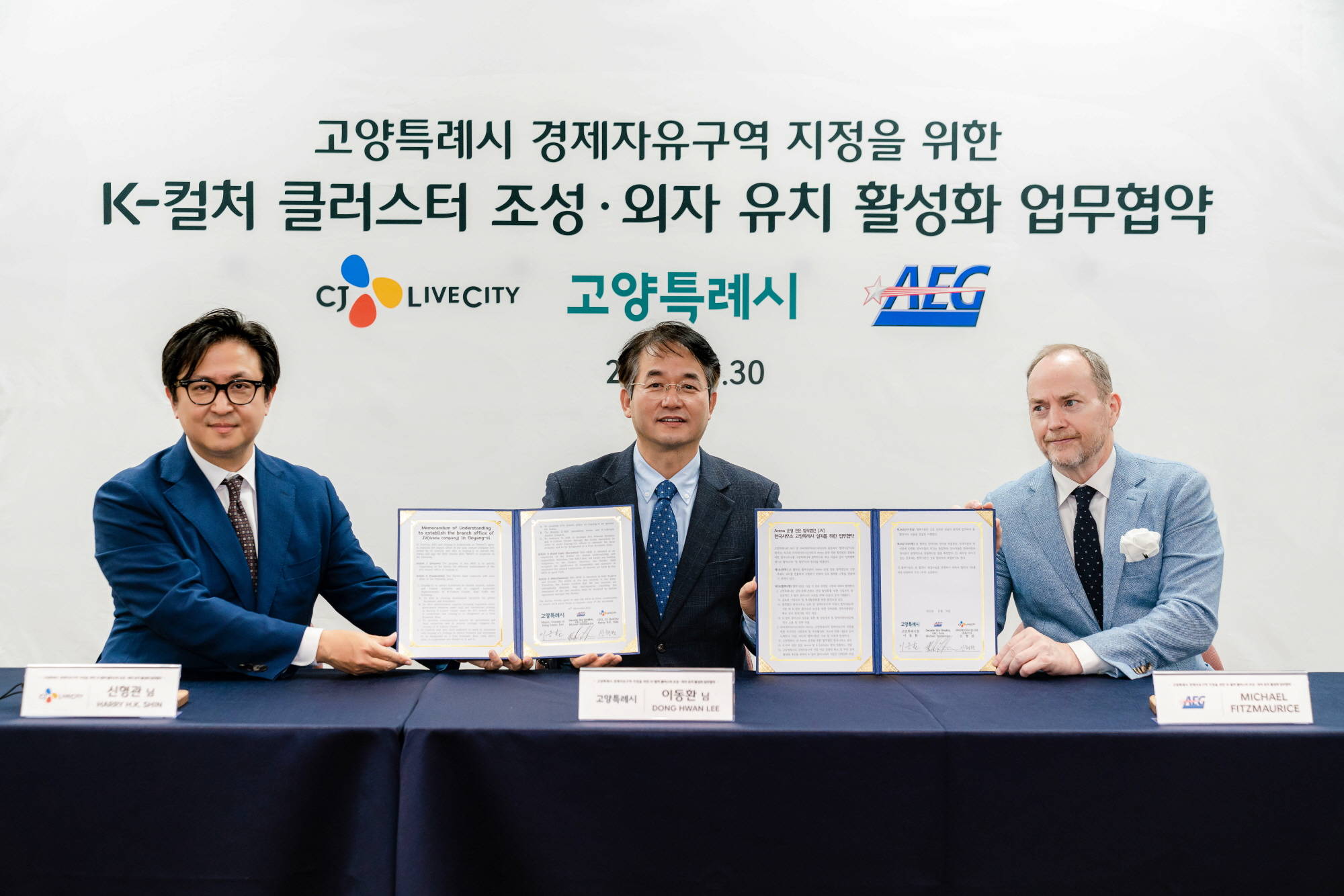 고양시는 30일 일본 오사카에서 AEG, CJ라이브시티(CJ LiveCity, 대표이사 신형관)과 ‘K-컬처 클러스터 조성 및 외자 유치 활성화를 위한 삼자 간 업무협약(MOU)’을 체결했다고 1일 밝혔다. AEG와 CJ라이브시티가 고양시의 경제자유구역 추진 5대 전략 중 하나인 ‘K-컬처 클러스터’ 구축을 위해 시와 다각도로 협력하기로 했다.