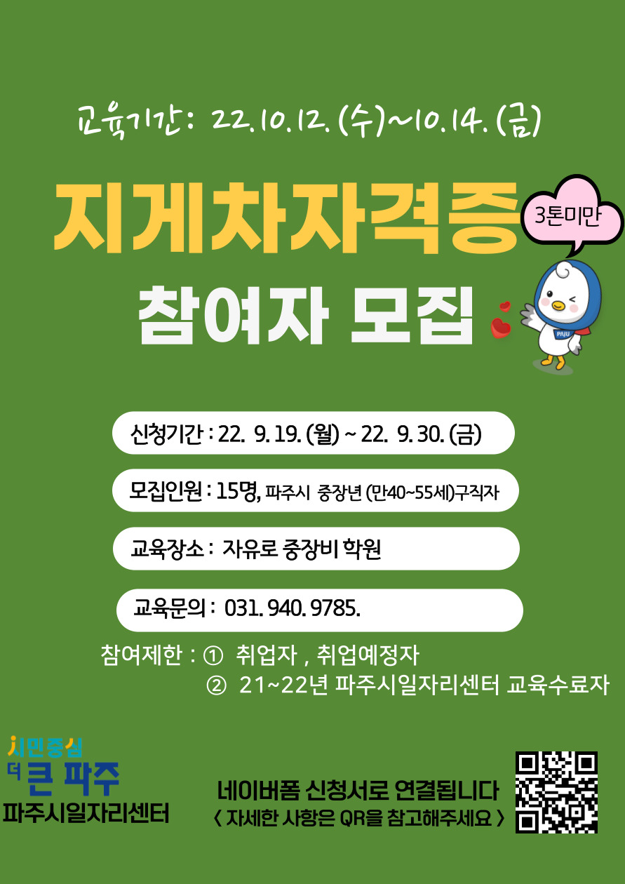 교육비는 전액 무료이고, 프로그램은 10월 12일부터 14일까지 자유로중장비학원(교하로 소재, ☎031-928-5599)에서 이론 6시간, 실습 6시간의 일정으로 진행되며, 교육 이수 후 취업 알선을 통한 사후관리도 함께 진행된다.