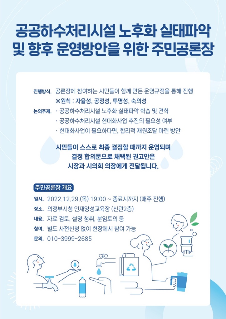 공공하수처리시설 주민공론장은 12월 29일(목) 저녁 7시부터 의정부시청 인재양성교육장(신관2층)에서 시작하며 종료 시까지 매주 진행한다. 의정부시민 누구나 참여를 신청할 수 있고 별도의 신청 없이 현장에서 참여해도 된다.