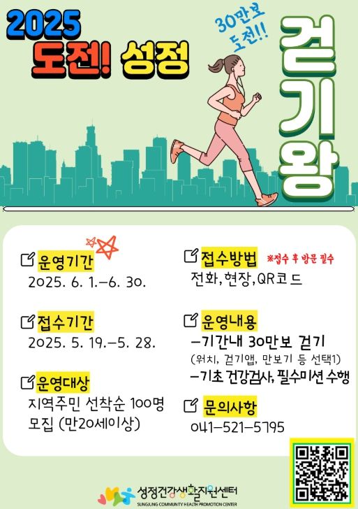 한방통신사 신태공 기자 | 천안시 서북구보건소 성정건강생활지원센터는 오는 6월 한 달간 ‘2025 도전! 성정 걷기왕’을 운영한다고 15일 밝혔다.