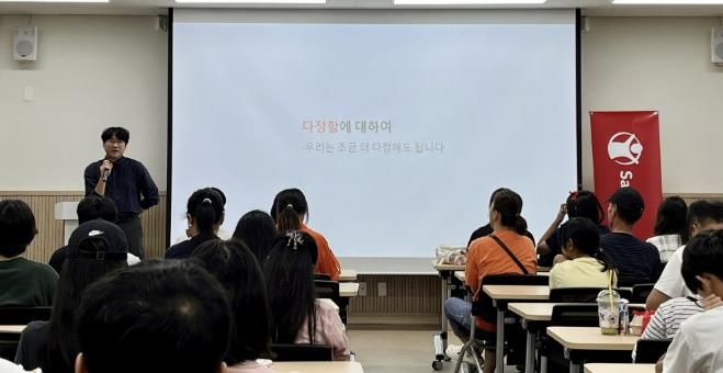 김민섭 작가는 ‘청소년에게 전하는 나답게 사는 이야기’라는 주제로 강연을 펼쳤으며, 자신만의 속도와 방식으로 행복을 찾아가는 삶의 중요성을 이야기하며 학생들의 큰 공감을 얻었다.