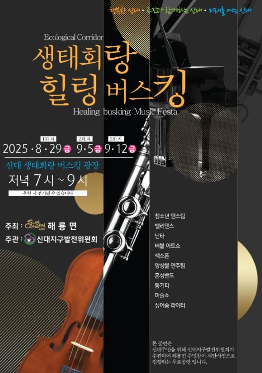한방통신사 신다은기자 기자 | 순천시 해룡면이 신대지구 생태회랑 버스킹 공연장에서 오는 8월 29일과 9월 5일, 12일 3회에 걸쳐 ‘생태회랑 힐링 버스킹’을 개최한다고 밝혔다.