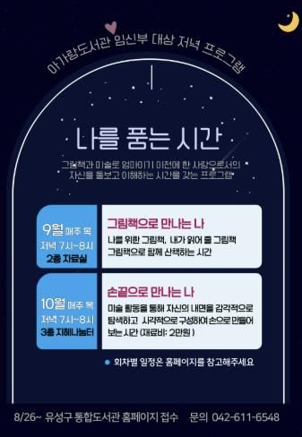 한방통신사 신태공 기자 | 대전 유성구는 9월부터 10월까지 아가랑도서관에서 임신부를 위한 감성 프로그램 ‘나를 품는 시간’을 운영한다.