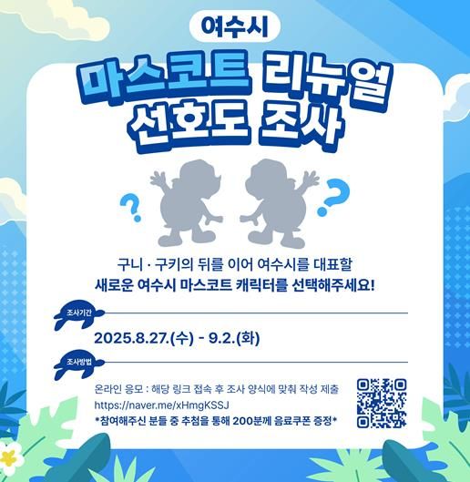 한방통신사 신다은기자 기자 | 여수시는 25년 만에 리뉴얼되는 마스코트(구키·구니) 디자인을 선정하기 위해 8월 27일부터 9월 2일까지 7일간 온라인으로 선호도 조사를 실시한다.