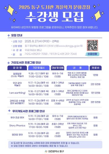 한방통신사 신태공 기자 | 대전 동구는 다음 달부터 12월까지 운영되는 ‘2025년 도서관 가을학기 문화강좌’ 수강생을 모집한다고 27일 밝혔다.