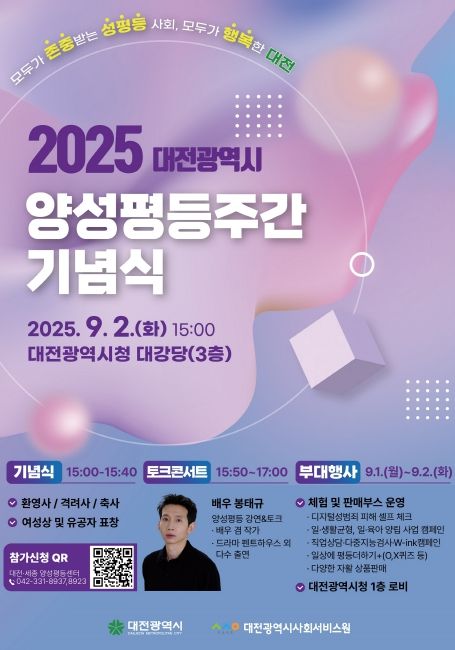 이번 행사는 누구나 무료로 참여할 수 있으며, 자세한 문의는 대전광역시사회서비스원 양성평등센터로 하면 된다.