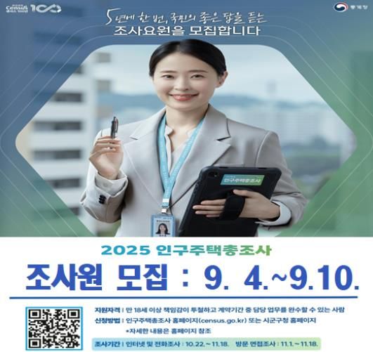 한방통신사 신다은기자 기자 | 광양시는 오는 10월 22일부터 11월 18일까지 전국적으로 실시되는 '2025 인구주택총조사'의 성공적 수행을 위해 현장조사 업무를 담당할 조사원을 모집한다고 28일 밝혔다.
