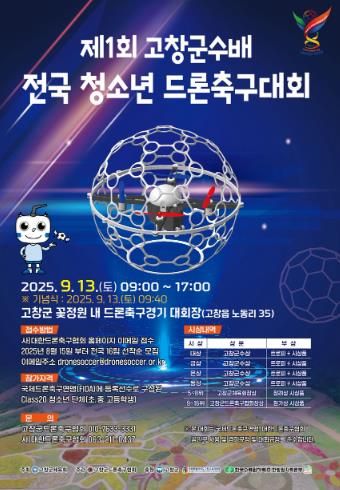 한방통신사 김성의 기자 | 고창군이 오는 13일 고창 꽃정원(고창읍 노동리 35)에서 ‘제1회 고창군수배 전국 청소년 드론축구대회’를 개최한다고 밝혔다.