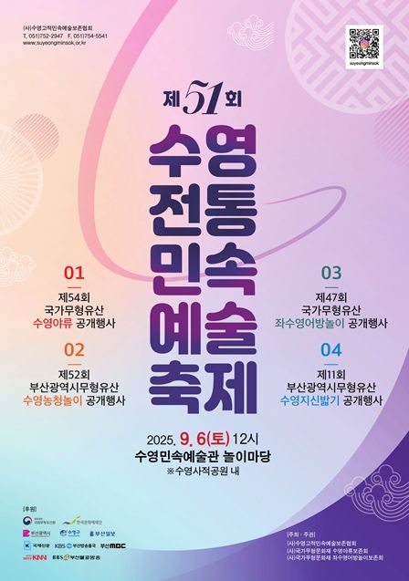 한방통신사 신유철기자 기자 | 부산시는 내일(6일) 정오에 시 무형유산 전수교육관인 '수영민속예술관 놀이마당'에서 무형유산의 보존과 원형 전승을 위해 '2025 제51회 수영전통민속예술제'를 개최한다고 밝혔다.
