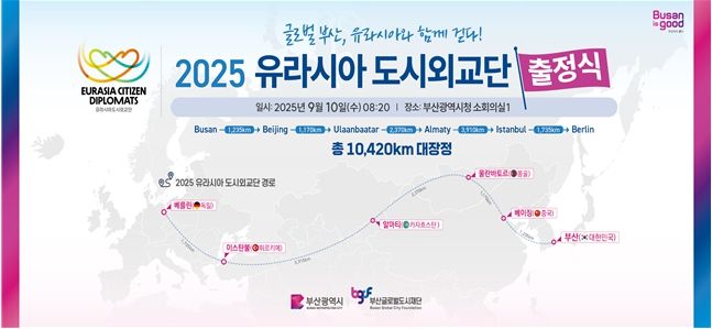 한방통신사 신유철기자 기자 | 부산시와 부산글로벌도시재단은 '2025 유라시아 도시외교단'이 글로벌 허브도시 부산 브랜드를 홍보하고 자매·우호도시와 교류 협력하기 위해 오늘(10일)부터 9월 25일까지 총 16일간의 여정을 떠난다고 밝혔다.