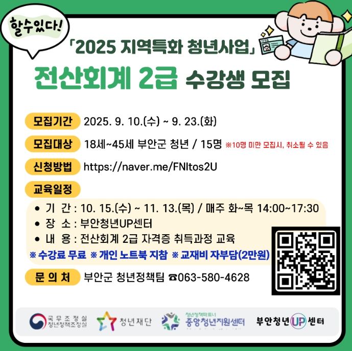 한방통신사 김성의 기자 | 부안청년UP센터는 지역 청년들의 회계 실무 능력 향상과 전문 자격 취득을 지원하기 위해 오는 10월부터 운영할 전산회계 2급 자격증반 수강생을 모집한다.