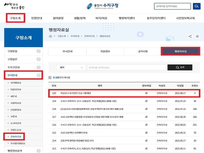 용인시 수지구는 지난 20일 건축물 착공신고 시 민원인들이 자주 놓칠 수 있는 부분을 미리 확인할 수 있는 자가진단 체크리스트를 구 홈페이지 건축허가과 행정자료실에 게시했다고 밝혔다.