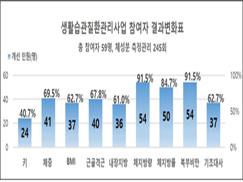 체성분 분석 결과에 따른 개별 상담과 함께 3대 영양소, 섭생, 운동을 실천하도록 지도한 결과, BMI 항목에서 37명, 내장지방 항목에서 36명, 체지방량 항목에서 54명 등 총 9개 항목에서 70.9%의 인원이 개선 효과가 있었다.