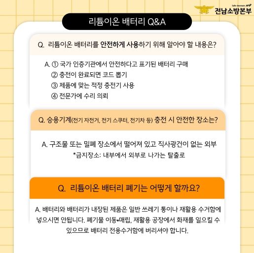 주요 사항으로는 △공인된 KC 인증 배터리 및 충전기 사용하기 △충전 시 반드시 사람이 가까이 있도록 주의 기울이기 △충전 완료 즉시 플러그를 뽑아 과충전을 방지하기 △배터리를 너무 뜨겁거나 차가운 환경에 노출하지 않기 △배터리가 부풀거나 이상 소리가 나면 즉시 사용을 멈추고 전문가에게 점검 받기 등이 있다.