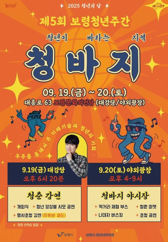 한방통신사 신태공 기자 | 보령시는 오는 9월 19일부터 20일까지 2일간 보령문화의전당에서 ‘제5회 보령청년주간’을 개최한다. 올해 행사는 ‘청년이 바라는 지역, 청.바.지 야시장’이라는 주제로, 청년들이 직접 기획하고 운영하는 지속 가능하고 세대를 아우르는 문화 축제로 거듭난다.