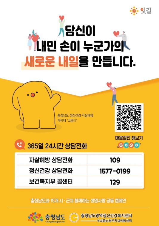 삶에 희망이 보이지 않을 때는 고민하지 말고 자살예방 상담전화(109), 천안시 서북구자살예방센터 동남구자살예방센터로 상담을 요청하면 도움을 받을 수 있다.