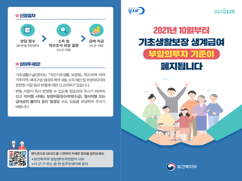 올해 초에는 국민기초생활보장 생계급여 신청 대상자 중 노인 65세 이상 또는 한부모가 포함된 수급(신청)자 가구에 대한 부양의무자 기준이 완화되었다. 부양의무자 기준이란 기초생활보장 수급(권)자의 1촌의 직계혈족 및 그 배우자의 부양능력을 조사해 수급 가능여부를 결정하는 것으로, 다가오는 10월부터는 노인과 한부모가구만이 아닌 전체 수급(신청)자 가구에 대한 부양의무자 기준을 적용하지 않는다.