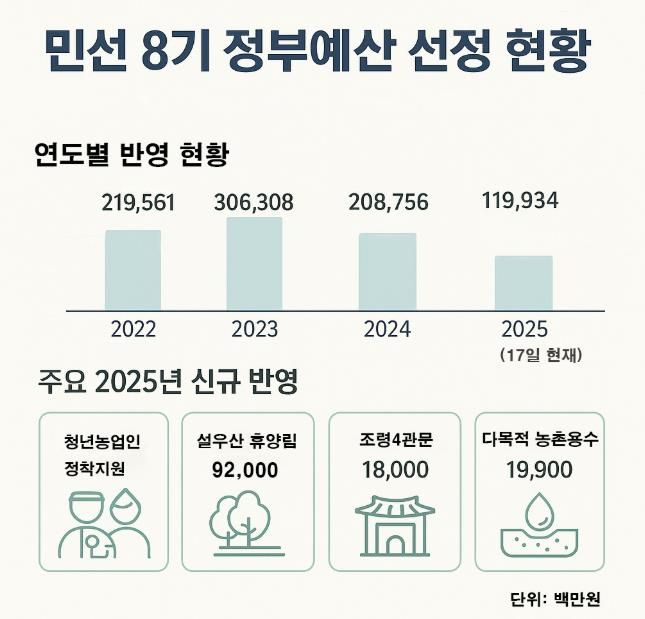 군에 따르면 2022년 7월부터 이달 17일까지 확보한 정부예산은 총 202건에 8,545억여 원 규모로 국·도비만도 5,628억 원에 이른다.