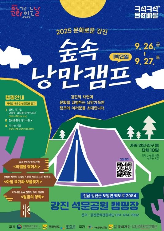 한방통신사 신다은기자 기자 | 강진군이 ‘2025 문화가 있는 날–구석구석 문화배달’ 사업의 하나로 ‘캠핑과 함께하는 문화로운 강진’을 오는 26일부터 27일까지 석문공원과 10월 31일부터 11월 1일까지 하멜 감성텐트촌에서 두 차례 진행한다.