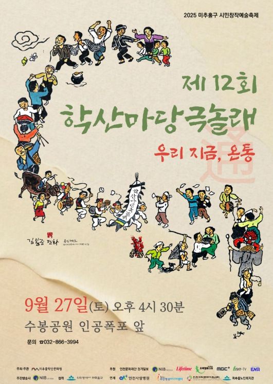 한방통신사 신유철기자 기자 | 인천 미추홀학산문화원이 주관하는 제12회 미추홀구 시민 창작 예술축제 ‘학산마당극 놀래’가 오는 27일 오후 4시 30분, 수봉공원 인공폭포 마당에서 개최된다.