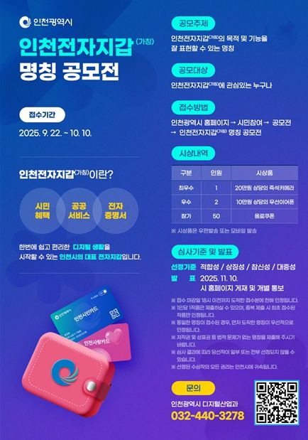 이남주 시 미래산업국장은 “인천전자지갑(가칭)은 시민의 일상과 가장 가까운 디지털 행정서비스로 자리매김할 것”이라며, “시민 여러분의 창의적인 아이디어를 통해 더 친근하고 활용도 높은 명칭이 정해지길 기대한다”라고 말했다.