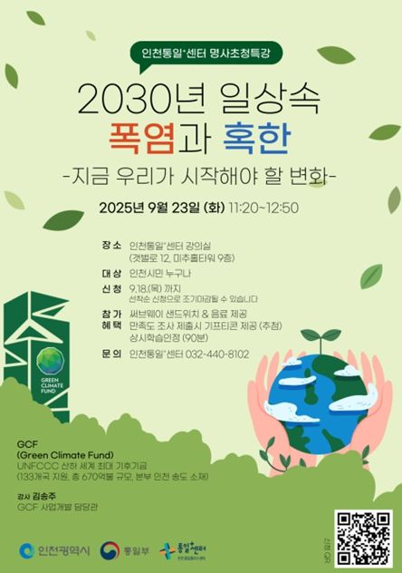 한방통신사 신유철기자 기자 | 인천광역시는 9월 23일 인천통일플러스센터(연수구 송도동 소재)에서 녹색기후기금(GCF)의 전문가를 초청, 기후위기의 심각성과 대응방안을 주제로 하는 특별 강연을 개최했다고 밝혔다.
