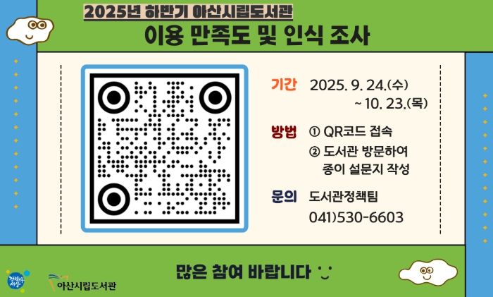 설문은 △도서관 서비스별 만족도 △도서관의 사회적 영향 인식 등 총 5항목으로 구성되며, 온라인(QR코드 접속)과 오프라인(아산시립도서관 7개관 내 비치된 종이 설문지 제출)으로 참여할 수 있다.