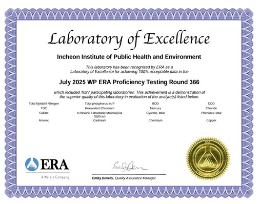 한방통신사 신유철기자 기자 | 인천광역시 보건환경연구원은 미국 환경자원협회(ERA)가 주관한 2025년 환경분야 국제숙련도 평가에서 ‘최우수 등급(Laboratory of Excellence)’을 받았다고 밝혔다.
