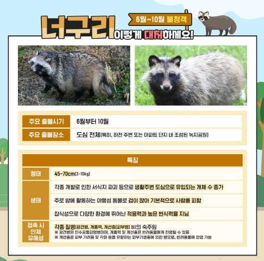 구 관계자는 “너구리가 굴포천 생태 환경이 개선되며 그 주변으로 서식지를 넓혀감에 따라, 발견 신고가 늘고 있다”며 “너구리는 포획 대상도 아니고 유해동물로 지정되어 있지 않지만, 접촉할 경우 광견병 등 각종 질병을 옮길 수 있어 접촉을 피해 주시기를 바란다”고 전했다.