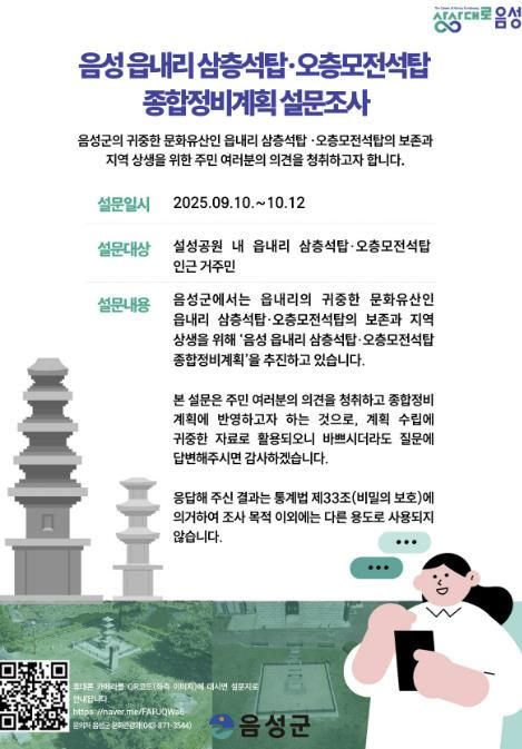 한방통신사 권영분기자 기자 | 음성군은 읍내리 설성공원 일원에 위치한 ‘음성 읍내리 삼층석탑’ 및 ‘음성 읍내리 오층모전석탑’의 종합정비계획을 수립하는 과정에서 주민 의견 수렴을 위한 온라인 설문조사를 실시한다고 밝혔다.