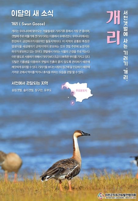 한방통신사 신태공 기자 | 서천군지속가능발전협의회(대표회장 신상애, 이하 서천지속협)는 2025년 10월 ‘이달의 새’로 멸종위기 철새 개리(Anser cygnoides)를 선정했다고 29일 밝혔다.