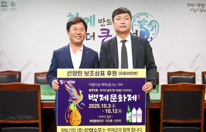박정현 부여군수는 “지역 기업의 참여와 후원이 백제문화제를 더욱 친근하고 따뜻한 축제로 만드는 원동력이 된다.”라며 “선양소주의 후원에 깊이 감사드린다.”라고 전했다.