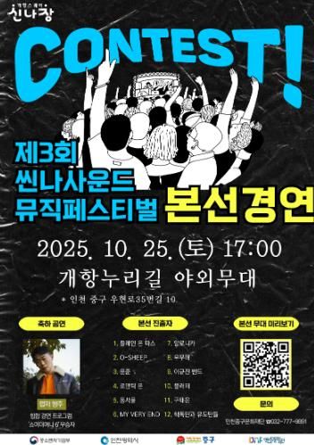 한방통신사 신유철기자 기자 | (재)인천중구문화재단은 오는 10월 25일 오후 5시 인천 중구 개항누리길 야외무대에서 ‘제3회 씬나사운드 뮤직 페스티벌’ 본선 경연을 개최한다고 밝혔다.
