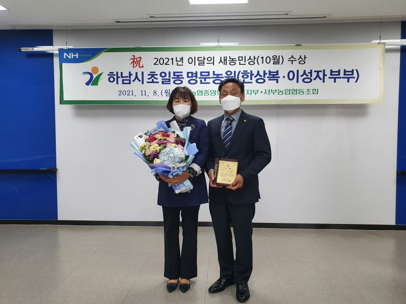 농협하남시지부(지부장 황성용)에서는 지난 8일 안종열 조합장(서부농협)이 참석한 가운데 「이달의 새농민상(像)」10월 수상자인 서부농협 조합원 한상복·이성자 부부에게 시상했다.