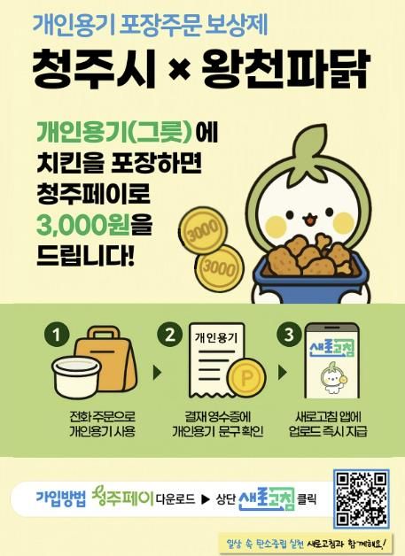 한방통신사 권영분기자 기자 | 청주시는 10월 1일부터 ‘새로고침’ 모바일앱을 통해 전국 최초 개인용기 포장주문 보상제를 시행한다. 참여자에게는 지역화폐인 청주사랑상품권(청주페이) 3천원이 보상으로 지급된다.