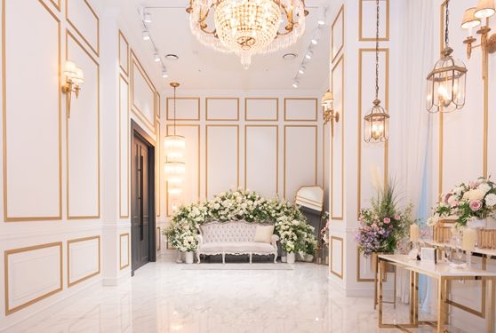 비즈컨벤션 중앙 무대와 신부대기실 입구의 플라워 장식을 보강하고 크리스탈 장식의 구조물을 새롭게 설치했다.