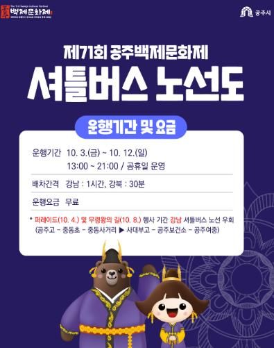 특히 ‘웅진성 퍼레이드’와 ‘무령왕의 길’ 행사 기간에는 강남 노선이 우회 운영돼 금강신관공원에서 옥룡동어울림센터, 대웅맨션, 옥룡주공아파트, 영우마을, 공주교대, 사대부고, 공주보건소, 공주여중을 거쳐 공산성 방문자센터로 이어진다.