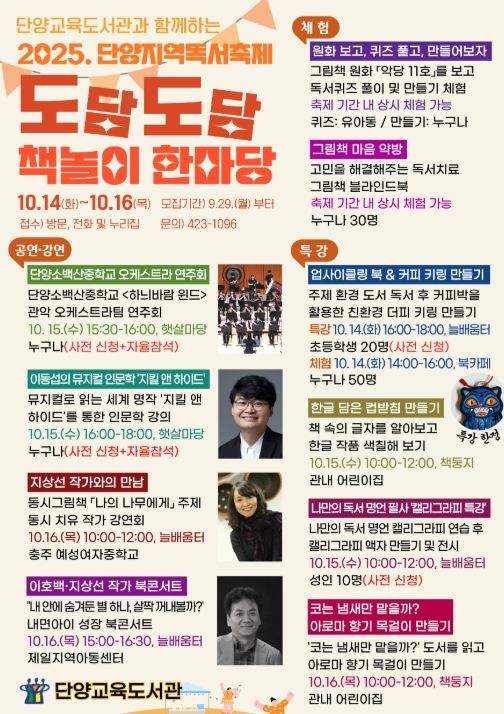 단양교육도서관 서현희 관장은 “이번 독서축제를 통해 교육공동체가 함께 성장하고, 지역사회의 독서문화 확산에 기여할 수 있기를 바란다”며,“책을 매개로 한 공연, 강연, 체험을 아우르는 북콘서트를 통해 세대 간 소통을 이어가고, 참여자 모두가 즐거움을 나누는 소중한 시간이 되기를 기대한다”고 전했다.