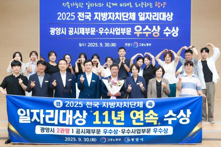 한방통신사 신다은기자 기자 | 광양시는 9월 30일 청주 오스코에서 열린 고용노동부 주관 '2025년 전국 지방자치단체 일자리대상' 시상식에서 공시제 부문과 우수사업 부문 모두 우수상을 수상하며, 2015년부터 11년 연속 수상이라는 값진 성과를 거뒀다고 밝혔다.