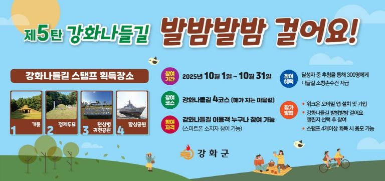 한방통신사 신유철기자 기자 | 강화군은 10월 한 달간 강화나들길 활성화를 위해 ‘제5탄 강화나들길 발밤발밤 걸어요!’ 챌린지를 진행한다고 밝혔다.